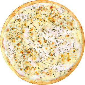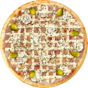 Azeitona verde, Bacon, Champignon, Frango desfiado, Milho verde, Molho de tomate fresco, Muçarela, Orégano