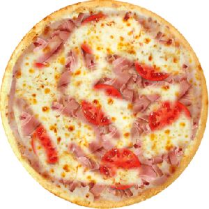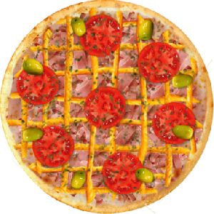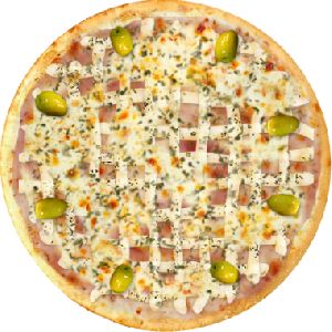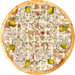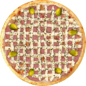 Azeitona verde, Molho de tomate fresco, Muçarela, Orégano, Presunto, Tomate em fatias