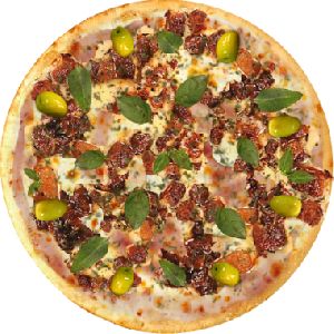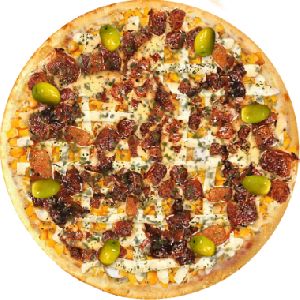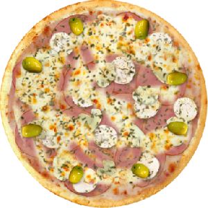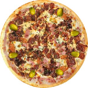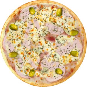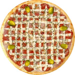 Azeitona verde, Bacon, Champignon, Molho de tomate fresco, Muçarela, Orégano, Presunto