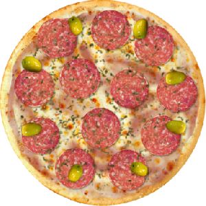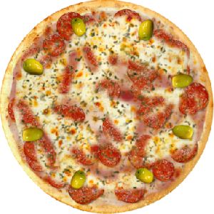 Azeitona verde, Catupiry, Molho de tomate fresco, Orégano, Peito de peru , Pepperoni