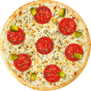 Azeitona verde, Manjericao, Molho de tomate fresco, Muçarela, Orégano, Parmesão ralado, Tomate em fatias