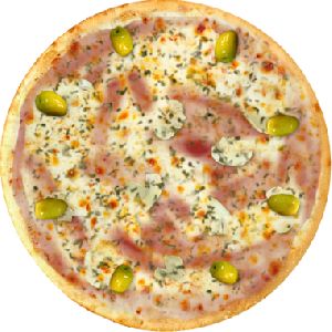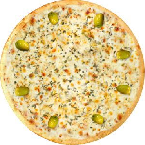 Azeitona verde, Catupiry, Gorgonzola, Molho de tomate fresco, Muçarela, Orégano, Parmesão ralado, Provolone