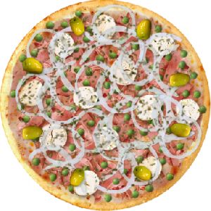 Azeitona verde, Bacon, Catupiry, Ervilha, Milho verde, Molho de tomate fresco, Muçarela, Orégano, Palmito, Presunto