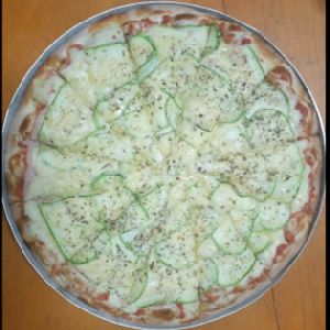 Abobrinha, Azeitona verde, Molho de tomate fresco, Muçarela, Orégano, Parmesão ralado