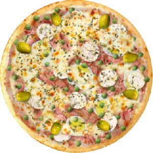 Azeitona verde, Ervilha, Milho verde, Molho de tomate fresco, Muçarela, Orégano, Ovo, Presunto