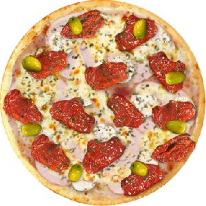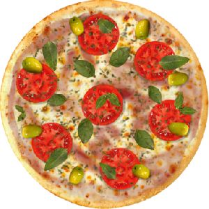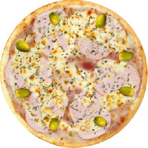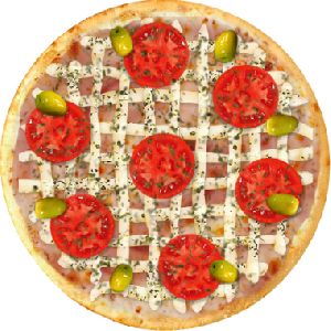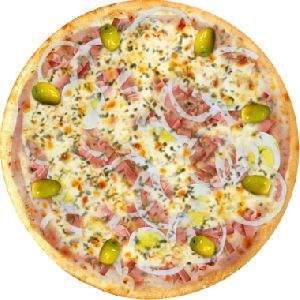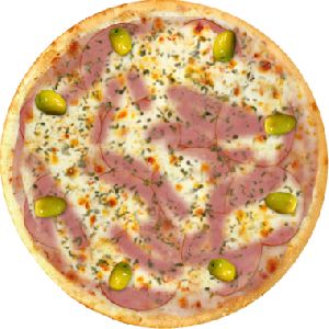 Azeitona verde, Molho de tomate fresco, Muçarela, Orégano, Presunto, Tomate em fatias