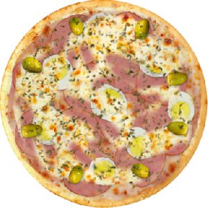 Azeitona verde, Cebolas, Molho de tomate fresco, Muçarela, Orégano, Ovo, Presunto
