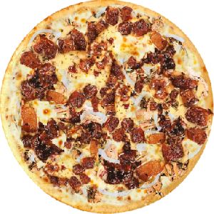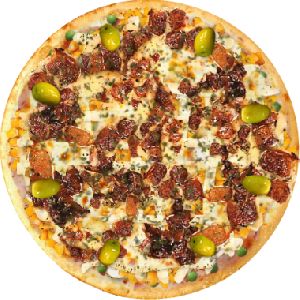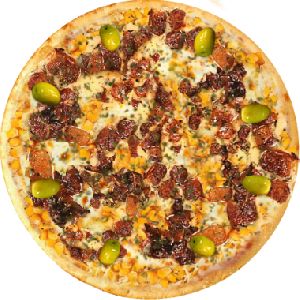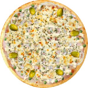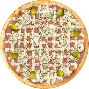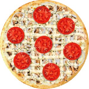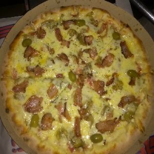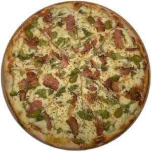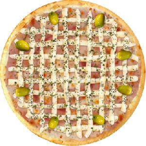 Azeitona verde, Bacon, Champignon, Frango desfiado, Milho verde, Molho de tomate fresco, Muçarela, Orégano