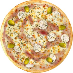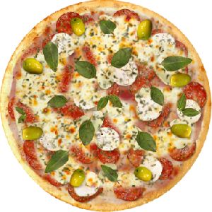 Azeitona verde, Bacon, Champignon, Molho de tomate fresco, Muçarela, Orégano, Presunto