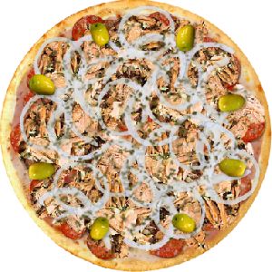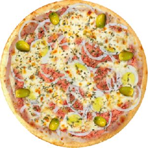 Atum Sólido, Azeitona verde, Calabresa Fatiada, Cebolas, Molho de tomate fresco, Orégano
