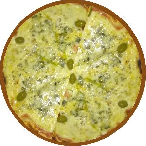 Azeitona verde, Catupiry, Gorgonzola, Molho de tomate fresco, Muçarela, Orégano, Parmesão ralado, Provolone