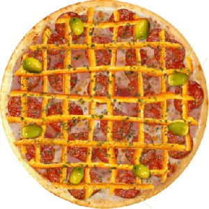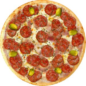 Azeitona verde, Catupiry, Molho de tomate fresco, Orégano, Peito de peru , Pepperoni